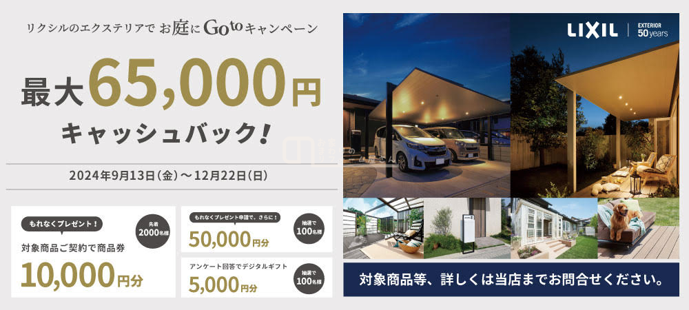 2023秋のLIXILお庭にGo to キャンペーンが始まりました 2023年9月20日〜12月20日までの期間中、対象商品をご契約いただくと抽選で商品券が当たるキャンペーンが始まりました! ガーデンルームで最大10万円