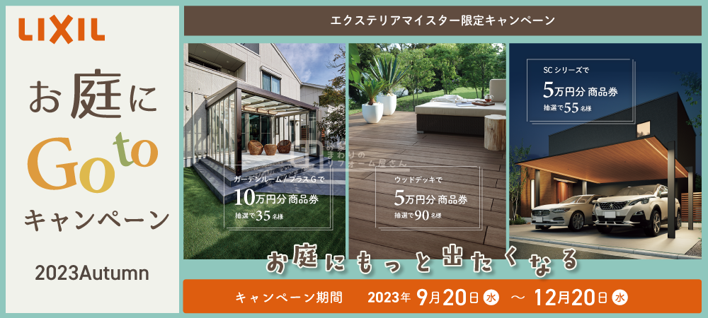 2023秋のLIXILお庭にGo to キャンペーンが始まりました 2023年9月20日〜12月20日までの期間中、対象商品をご契約いただくと抽選で商品券が当たるキャンペーンが始まりました! ガーデンルームで最大10万円