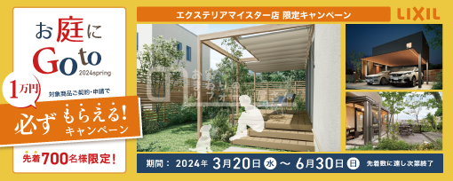 2024春のLIXILお庭にGo to キャンペーンが始まります 2024年3月20日〜6月30日までの期間中、対象商品をご契約・申請で10,000円が必ずもらえるキャンペーンが始まりました! キャンペーン対象商品など詳