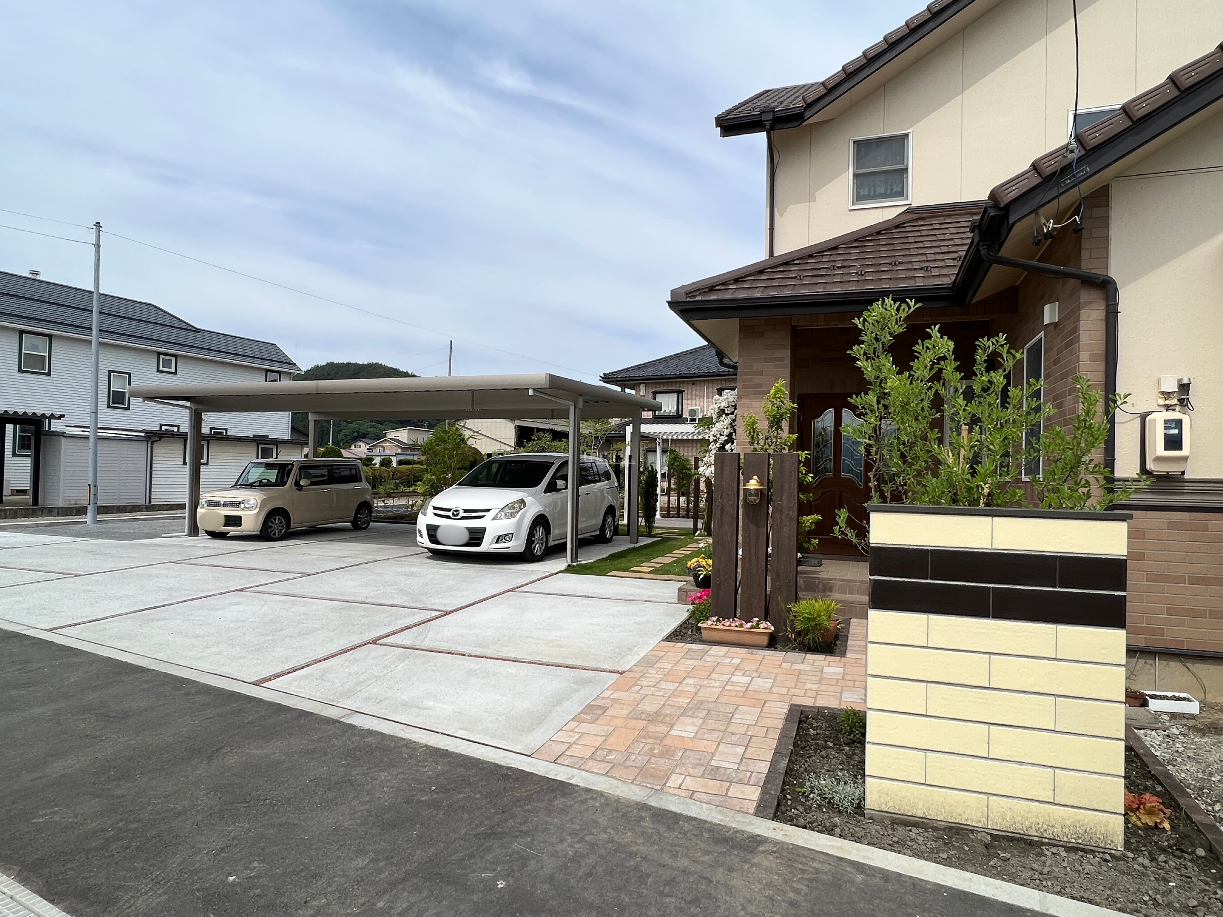 駐車スペースは転回スペース、来客時にお車が止められるように広いコンクリート舗装に仕上げました。