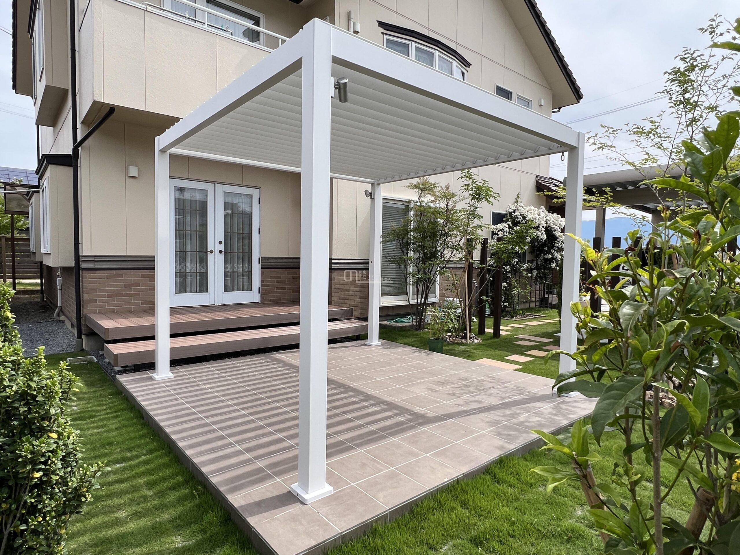 メインステージはウッドデッキから続くタイルテラス、そして手動式のテラス屋根になります。お天気のいい日は開け、急な雨や日差しをしっかり避けたいときには閉めて雨風日除けになるテラス屋根です。夏にはここでBBQをしたくなりますね。