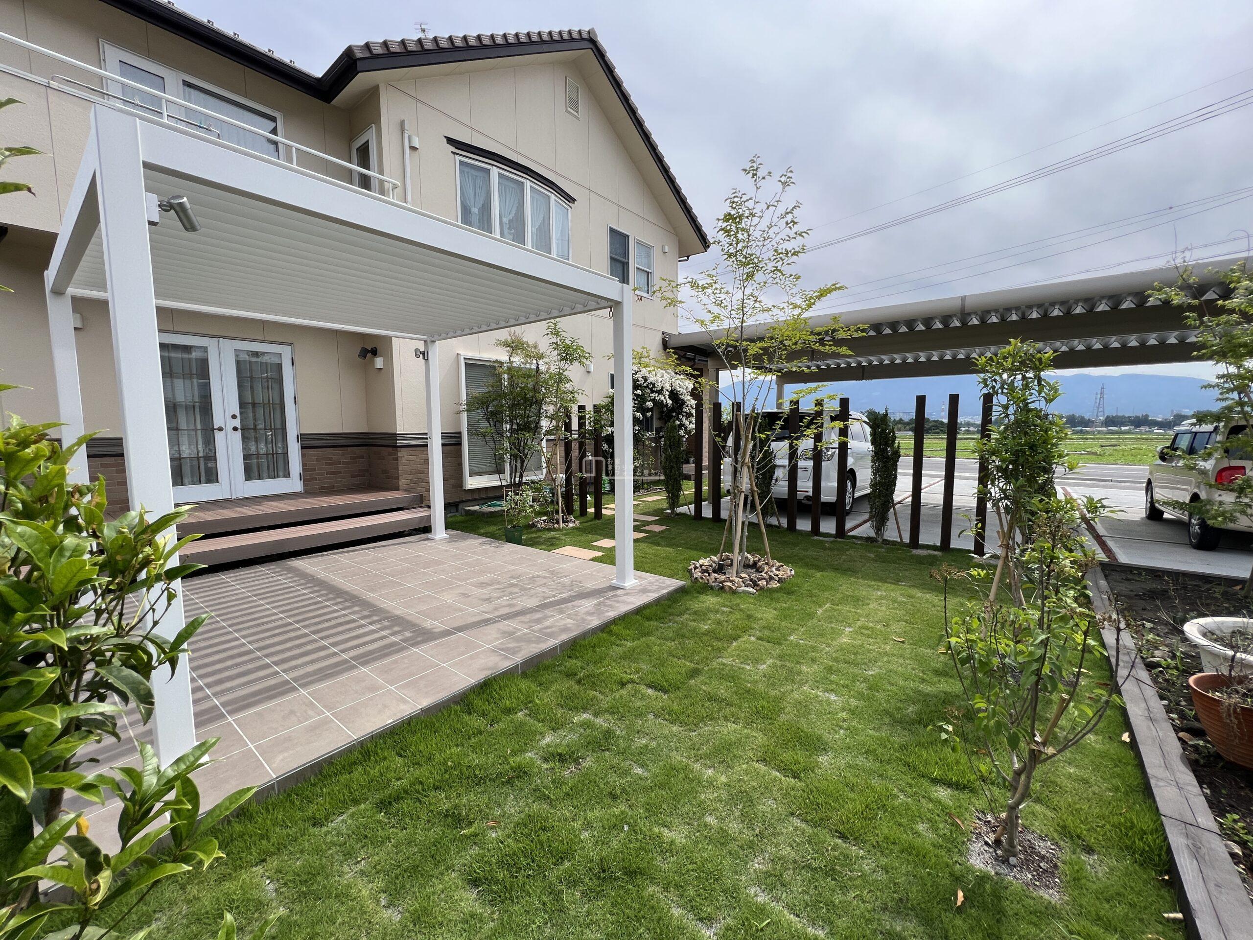 その先には青く元気に茂った天然芝が敷かれ、よりお庭を引き立たせてくれています。
