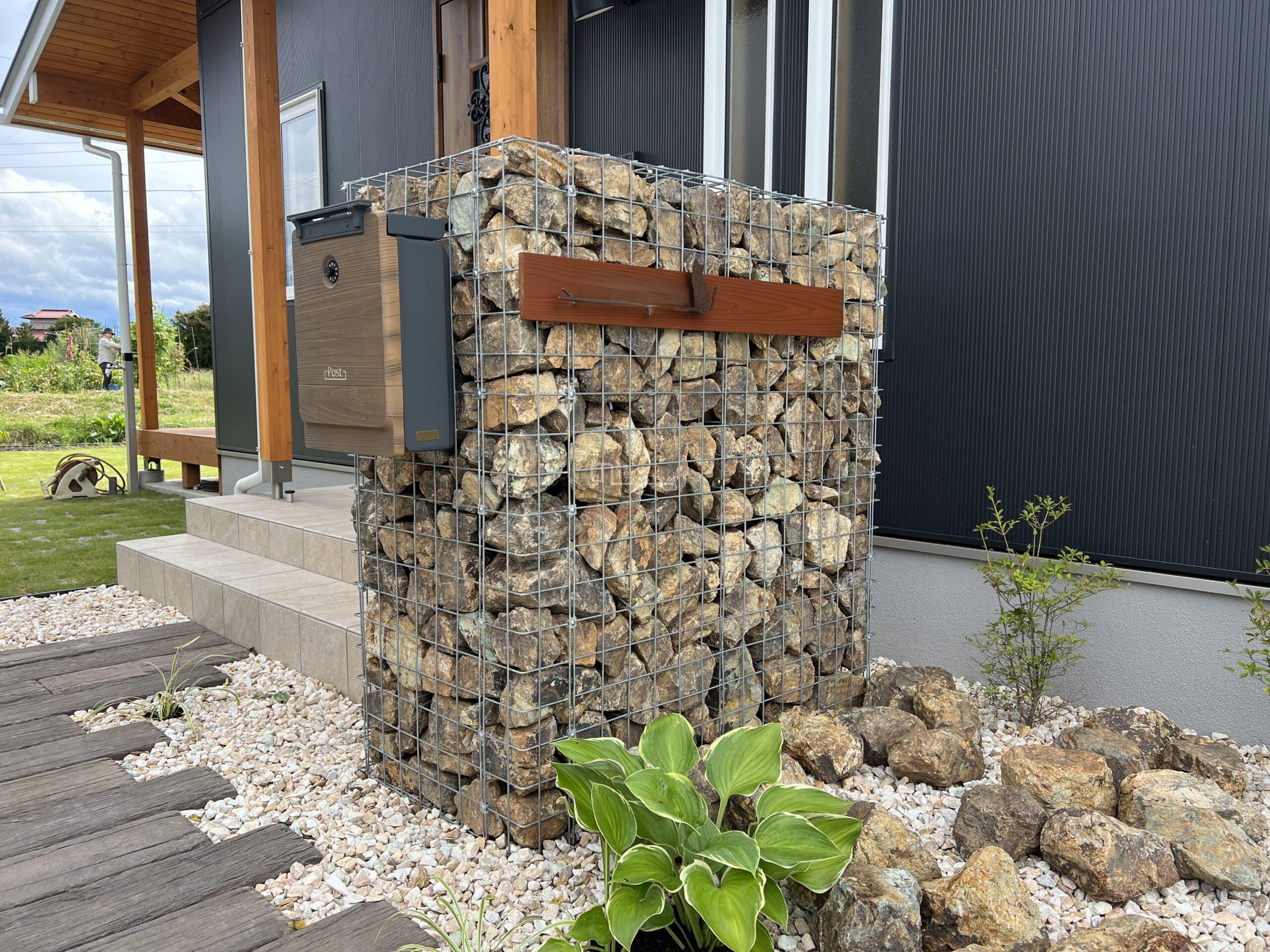 近年流行になりつつある『ガビオン』。少し分かり難いですが門袖はL字になっており、それぞれにポストと表札を設置しています。